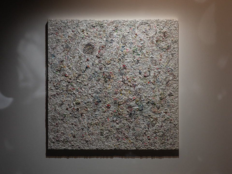 “Works in my Fetish series were created using dry paint skin, a discovery I made when I was cleaning my palette one day and managed to pull out thick layers of dry paint residue from my palette. I thought that was beautiful and unexpected. I later recreated the residue and rolled them into tiny rosettes, cut and sliced them like onions, and reattached them onto the canvas. This is a process of construction, deconstruction and reconstruction.” —Jane Lee