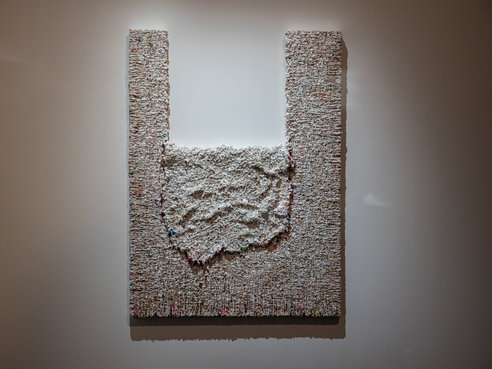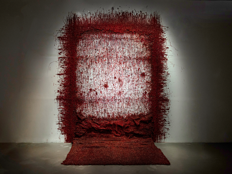 In Status, Lee meticulously weaves paint into a large, luxurious textile. Challenging the conventional perception of painting as a framed, two-dimensional object, its surface is peeled off the wall and allowed to droop, piling up on the floor as if it is a surplus of representation. Still, the work clings to the wall, refusing to let go of its status as a “painting,” as an image. Here, the work symbolises resistance to the fetishisation of a finished picture and liberation from the limitations of painting. Stripped of its centre, what remains of the painting is a void but also a space for boundless signification.