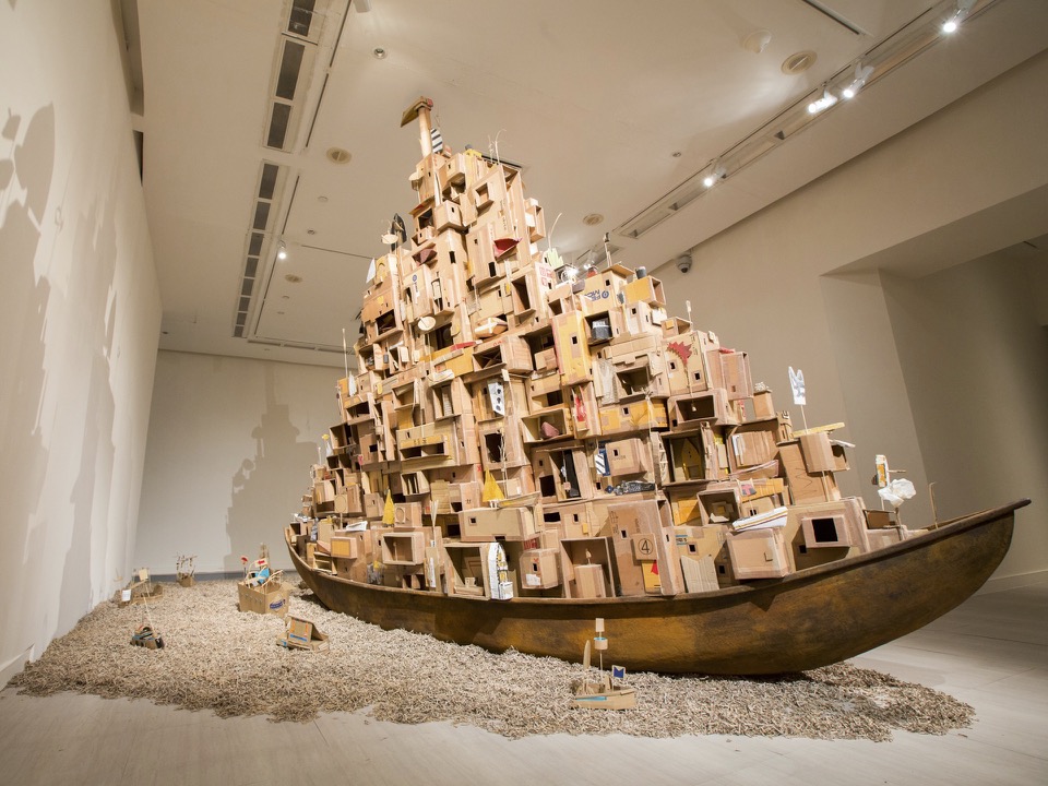 Addressing issues surrounding the idea of journeys and diaspora, Passage III: Project Another Country is one of many projects that evolved out of the artist duo’s relocation from the Philippines to Australia. Now diaspora artists themselves, the Aquilizans extend their artistic interrogation of settlement and resettlement through this artwork, and explore the specificity of place as well as the complex emotions arising from social dislocation. The re-purposed cardboard utilised in the installation is arranged to resemble a shanty town perched unsteadily on a wooden boat, suggesting the precarity of homes and of “home”, which leads to the necessity for change and journeying.