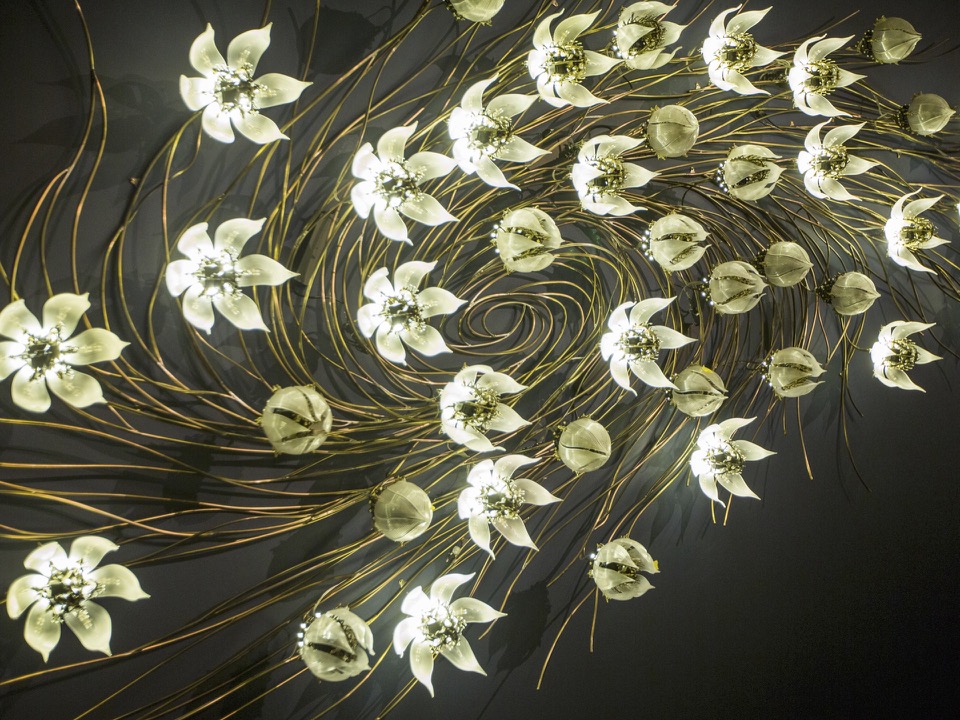 Ultima Mudfox and Una Lumino Callidus Spiritus are examples of intricate, biomorphic, kinetic sculptures which typify Choe U-Ram’s artistic practice. Born of metal, motors and machinery, these sculptures come alive with movement. Choe takes animation as a signifier of life, and their Latin names and artist-composed stories enhance the plausibility of the existence of these wondrous creatures.
