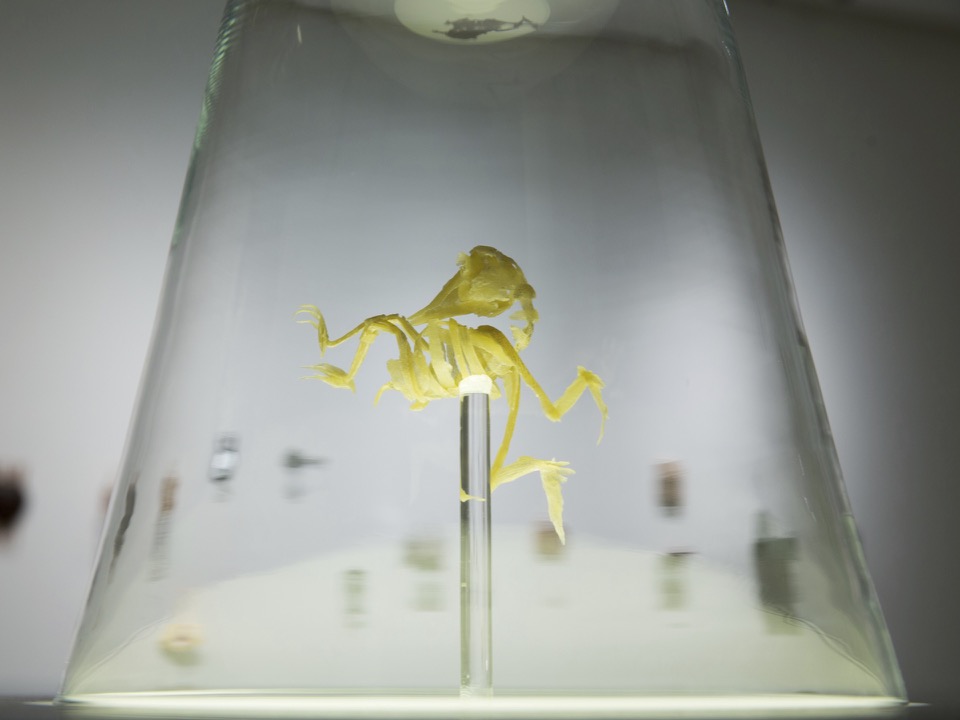performative installation with talcum powder, artist's skin, nails, adhesive, second-hand furniture and glass bell jars