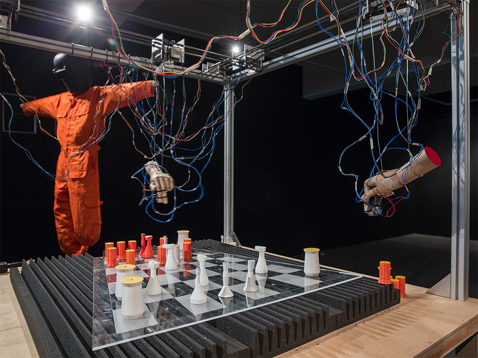 installation with custom designed mechanical turks, computer-programmed chess game, 3D printed chess pieces and jumpsuits; rubber ducks