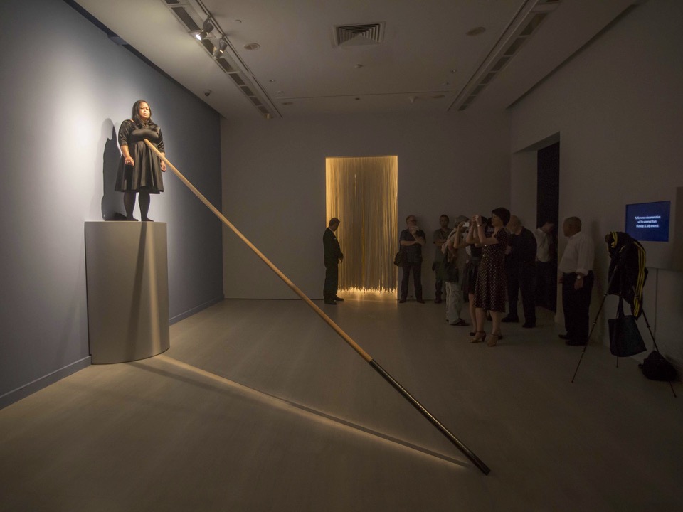 Drawing on meditation practices from Javanese ritual traditions, as well as her years of training with butoh and durational performance practitioners, Suryodarmo enters an altered state of consciousness, bringing her body and mind into unified stillness, attempting an emptying-out of the body and hence, a transcendence of pain, discomfort and physicality. The title of this work, Alé Lino, is taken from the Bugis language and refers to the ‘middle world’ inhabited by humans, in between the ‘upper world’ of the heavens and the ‘lower world’ that lies beneath the surface of the earth. On her elevated plinth, Suryodarmo performs an attempt to move beyond materiality and this middle world with a long pole that simultaneously connects her to the earth even as it rests against her solar plexus – considered by many to be the seat of an etheric field and hence, of the transcendent body or self.