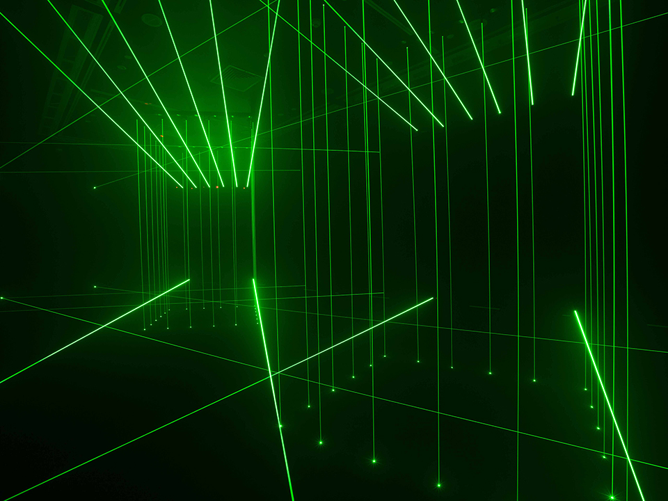 Artist Li Hui works with laser beams that sculpt and define the spaces they inhabit, even as they evoke otherworldly dimensions. In Cage, Li uses green lasers to create two virtual cages that appear alternately. The effect of these immaterial beams of light creates an impression of something solidly material, which in turn triggers instinctive responses of disorientation and even anxiety in viewers, who find themselves ‘trapped’ one moment, and standing outside the object of their imprisonment the next. While this work relies on visual and spatial perception for its initial sensorial and psychological impact, it suggests at a philosophical level, the imaginary boundaries that people determine for themselves are almost wholly reliant on perception rather than reality.