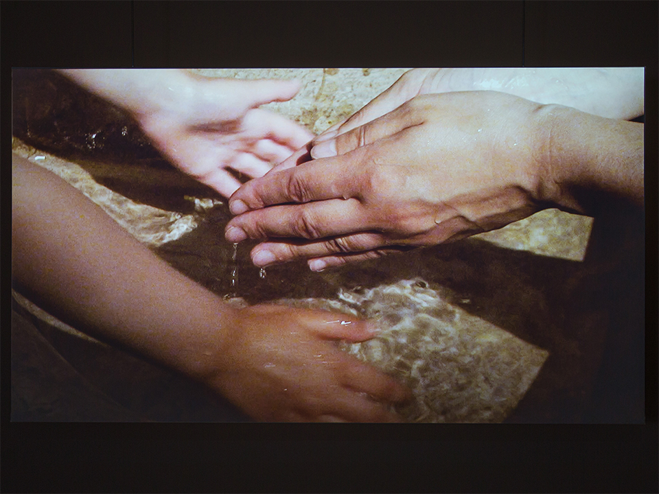 Baptism, which was filmed at the Medieval medieval church of Saint Severin in Paris, France, features a close-up video of the Christian rite frequently performed on young children as a ritual of joining the faith. In this initiation tradition, Tsai presents what she calls a “reverse baptism”, where it is the hands of a child cleansing her mother’s hands, rather than that of a parent or an elder blessing the child.