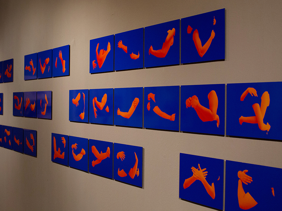 Alluding to Henri Matisse’s gouaches découpés, the unexpectedly rich orange colours of the bodily abstract forms in this series are choreographed against a brilliant, placeless blue background. However, unlike the famous paper cut-outs, the embraced and embracing figures are not imagined: they have an indexical nature, having been extracted from original photographs circulated on social media platforms, which Yee sourced via her own network of family, friends and acquaintances.