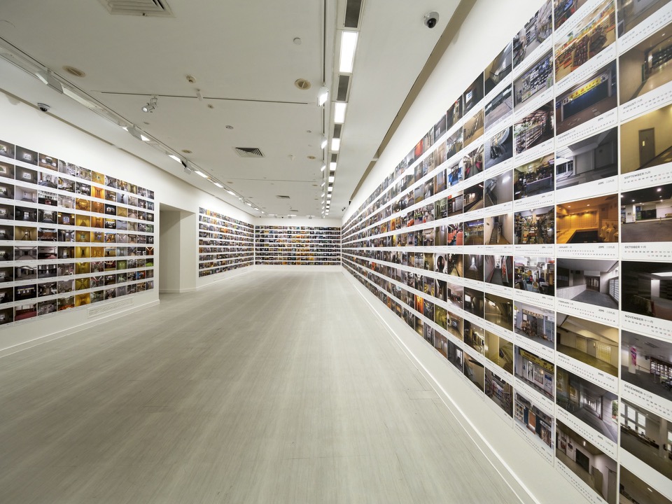 One-thousand-and-one picture calendars are installed in a grid covering the walls of an entire room. The photographs in the calendars show spaces that anybody can access, like shops, restaurants, and halls, which are in that sense not private, but the inexplicable lack of figures in them gives them an uncanny atmosphere.