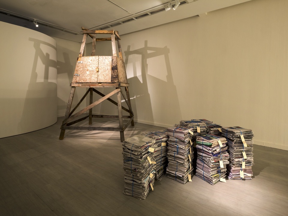 Much of Thai artist Pratchaya Phinthong’s conceptually driven practice is premised on collaborative processes, modes of exchange and the transference of artistic agency that redefine the value and significance of art. Give More Than You Take is an ongoing project that began in 2010 when the artist travelled to Sweden to work with Thai workers hired to pick wild berries, and paid in accordance with the amount of produce they collected. Each day, Phinthong informed the curator of the French gallery, where he was to present his work, the weight of the berries he picked with instructions to gather materials of an equivalent weight to be his artwork. In this exchange, the value of artistic and menial labour is conflated. Phinthong’s artwork both challenges and determines the form, legitimacy, and meaningfulness of art, and is one that is underpinned by other economic realities at large. The project culminated in the form of a 549kg artwork equivalent to the total weight of berries picked in Sweden throughout the course of two months. A second component of Give More Than You Take involved the exhibition curator reassembling the wood pieces that came from a shooting tower that Phinthong and the berry pickers took down. This project continues in Time of Others, where the exhibition curators improvise new ways of displaying the work as a way of negotiating with notions of value in art-making.
