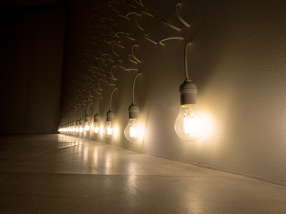 Inspired by his mother’s sewing practice and the communal activity of Aboriginal net-making, Jonathan Jones creates dazzling electric light installations that draw equally on the aesthetic strategies of non-objective art and traditional cultural designs. Though resembling American minimalism, the canonical fluorescent light works of Dan Flavin in particular, Jones’ work draws its configurations from the artist’s research into his Aboriginal heritage, with particular reference to ceremonial pattern-making, as well as encounters between Indigenous and non-Indigenous Australian communities. The question of community is central to the installation lumination fall wall weave, in which electrical cords are literally woven through a wall in repeated loops modeled on the shape of the canoes used by the Cadigal people of Sydney Harbour and surrounds. Domestic light bulbs hang from their ends in a long row hovering just above the gallery floor, a reference to the campfires reflected on the water that were described by the first Europeans to arrive there. This sensory field created by the light and the electricity pulsing through the woven cords suggest a single entity, operating as a metaphor for community and encounters with otherness; from ”first contact” to the experience of sharing a space with another person.