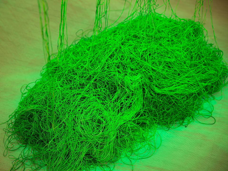Educator Jennifer Ng created this installation as a metaphor for the pressures and demands foisted onto her young charges by the education system. In aiming to ‘stretch’ students to their fullest potential, the rigours of contemporary schooling in Singapore instead wear down the energy and spirit of youth, stretching them thin, like tender young blades of grass which have been compelled to grow too quickly and before their time.