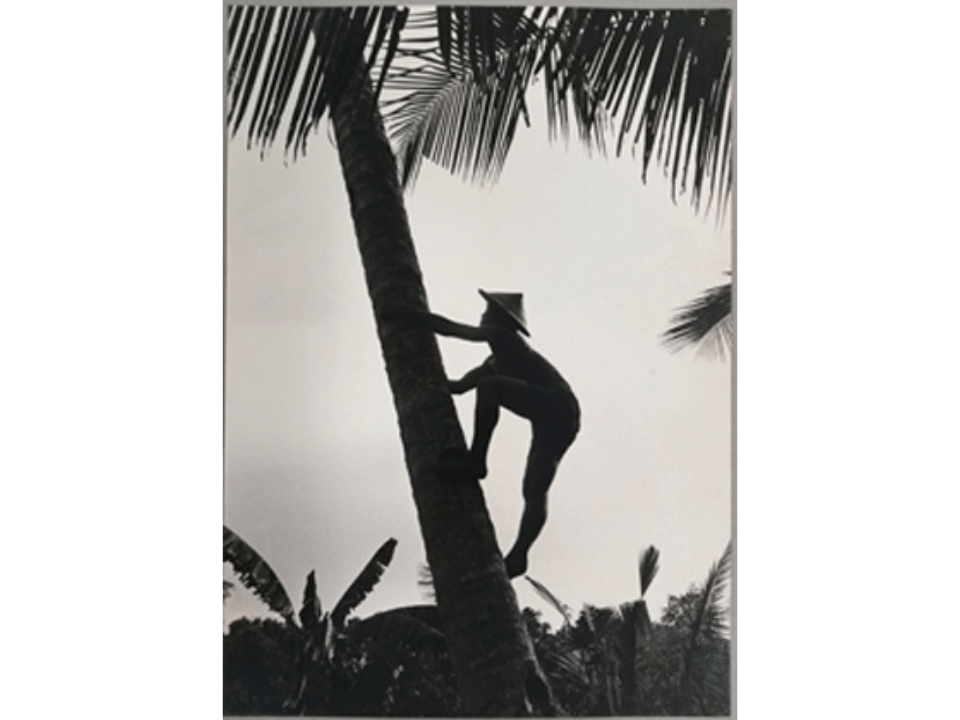 In this photograph, the climbing figure ascending a coconut tree trunk is likely a coconut harvester. The use of light and shadow in this photograph adds a sense of action and dynamism to the subject photographed.