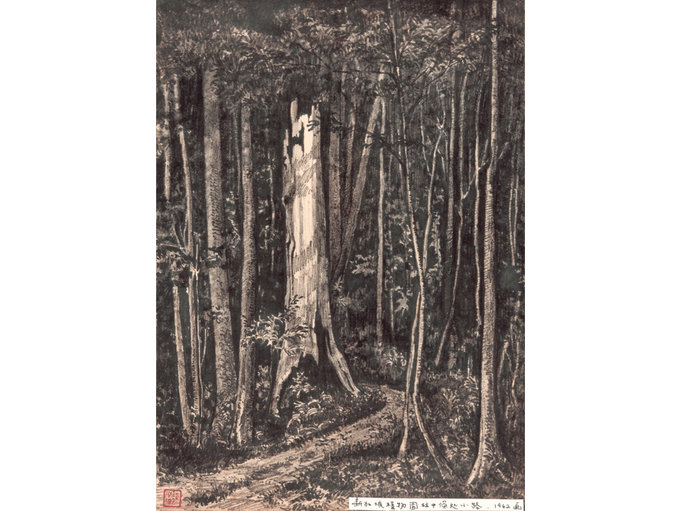 This work shows a dense forest—tree trunks which stretch nearly across the whole paper, one trunk after another. There is no human figure in sight and perhaps the artist was alone when he came across this scene. To be alone in a deep forest, especially for a long period as evidenced by the detail in his sketch, can take great courage.