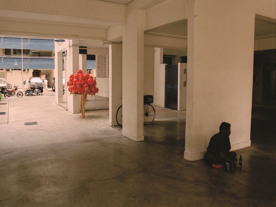 “Strange Fruit” comprises a series of photographs documenting Lee Wen’s journey through the streets and coastline of eastern Singapore, dressed up as the titular ‘strange fruit’. This performance was a continuation of the artist’s earlier explorations of identity and ethnicity, and took place during the mid-autumn celebrations in Singapore -- the artist’s way of marking the festival with a “one man lantern procession”. The red lanterns, which obscure Lee Wen’s face and upper torso, along with his yellow body paint, are exaggerated signifiers of ‘Chinese-ness’. This surreal and over-the-top image alludes to the stereotypes that arise when people judge others solely on the surface. At the same time, the title of the work makes reference to a song made famous by Billie Holiday, wherein ethnicity becomes a confining prison by which one is judged, obliterating all other facets of one’s identity or personality.