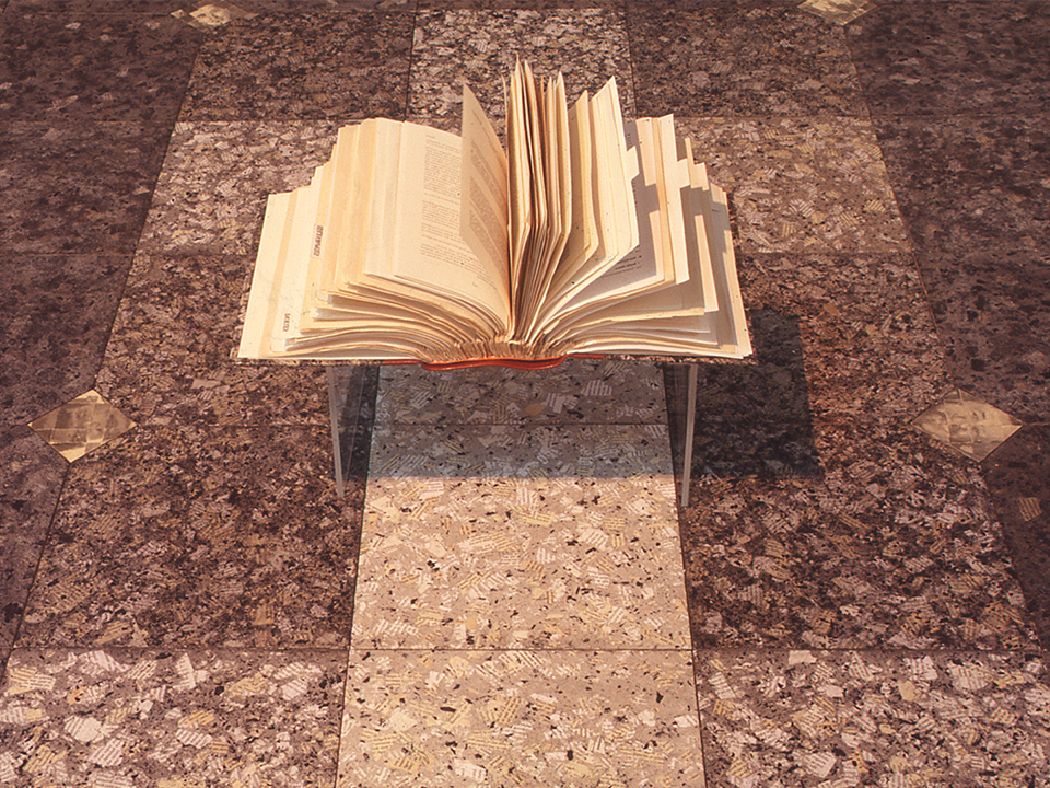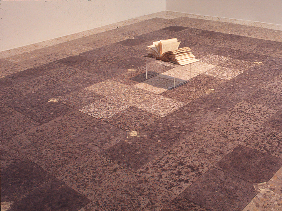 250 ceramic tiles made covered with pulped paper (textbooks, history books and political biographies); 20 inset tiles of images of faces; one bound book