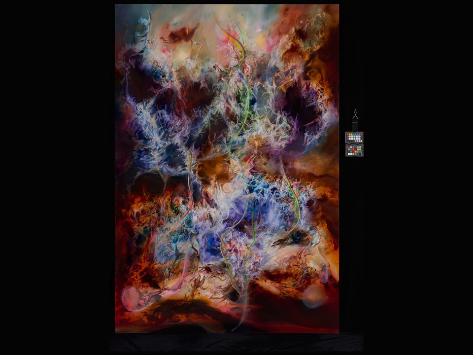 In Type 0 Civilization, Ruben Pang – inspired by his travels in Europe – seeks to recapture Peter Paul Rubens’ iconic religious painting, The Fall of the Damned. With no pre-determined goal in mind, Pang’s brushstrokes are led by intuition, reflex, and accident, and the work’s colours take on seemingly musical qualities of counterpoint and harmony. The work’s title makes reference to the Kardashev scale, perhaps suggesting that an unfettered thirst for power is a path to ruin. The Kardashev scale is a means to measure a civilization’s technological advancement based on the amount of energy it is able to use.