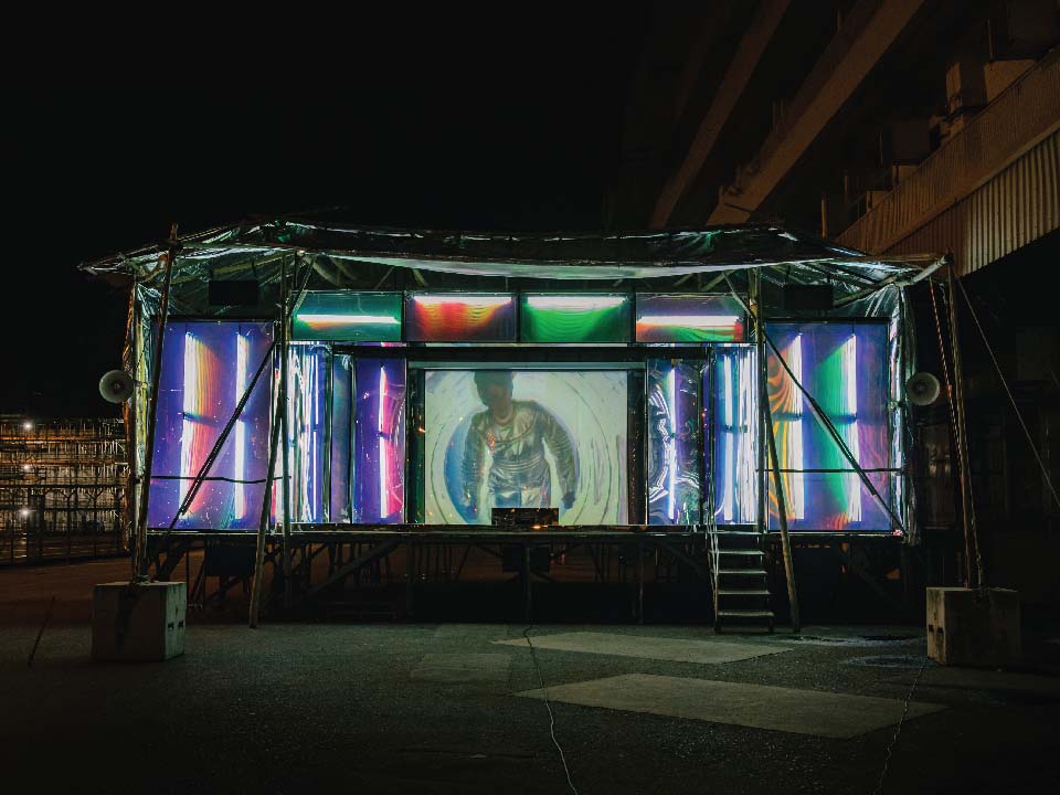 A Wayang Spaceship has landed on our shores. Alongside the industrial, technological and ecological crises that have taken place throughout time, it also stands witness to our place in the cosmos. During the day, the Wayang Spaceship is seemingly dormant, its reflective surfaces mirroring the bustling traffic around the container seaport. Its own inactivity is interrupted by the occasional stray radio transmission relayed from another dimension.